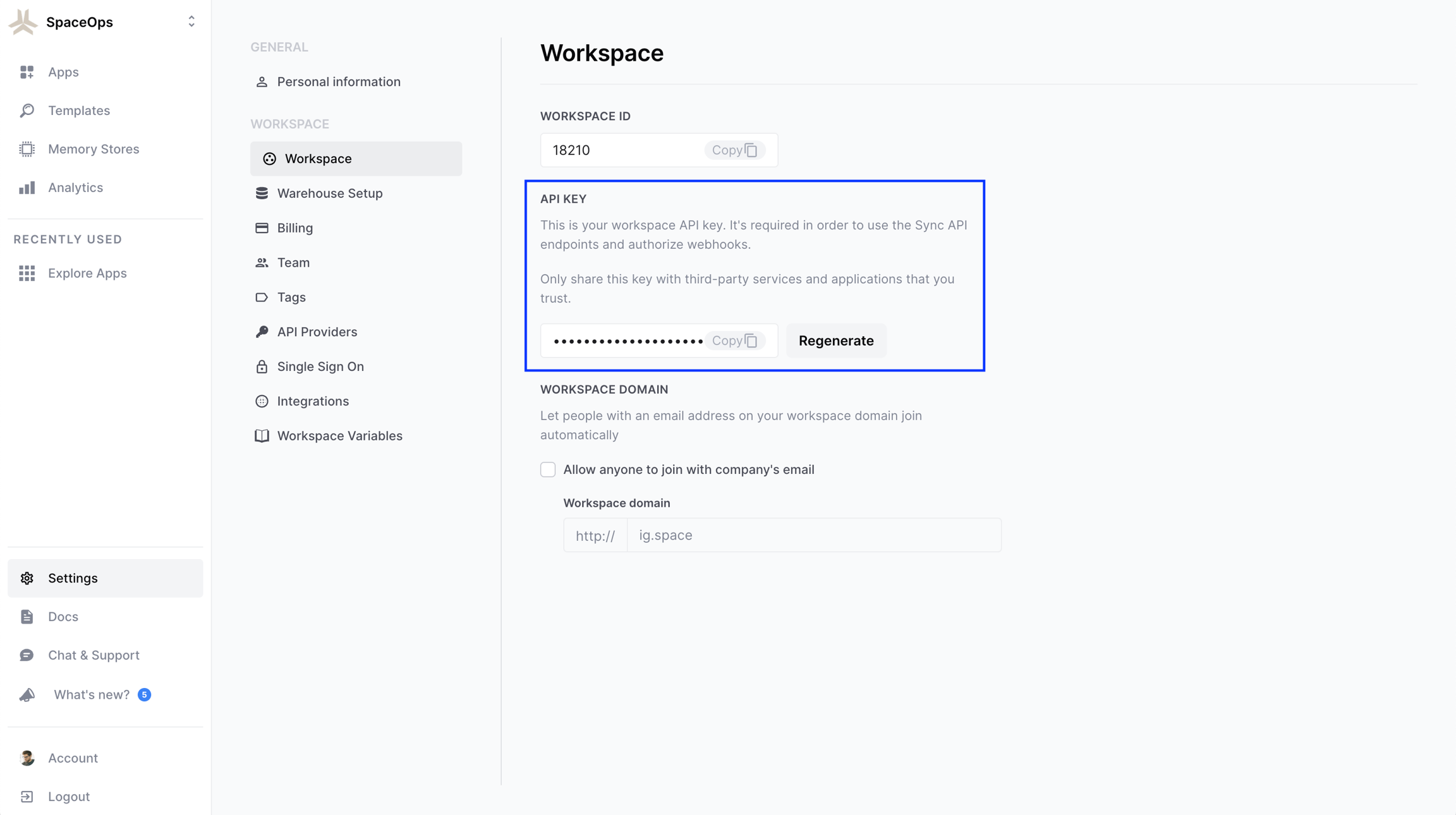 Your API key can be found in the "Workspace Settings" section of your account. Please note that your API key is a secret and should be kept confidential, and you should never expose it in any client-side code (browsers, apps) or share it with unauthorized parties.