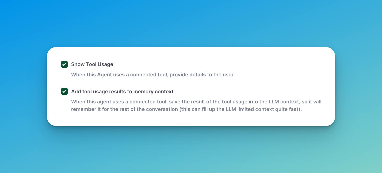 If you are enabling the "Add tool usage results to memory context" checkbox, be sure to keep in mind the potential downstream impact on your limited LLM context, i.e. you can quickly overload your LLM context by storing the results.