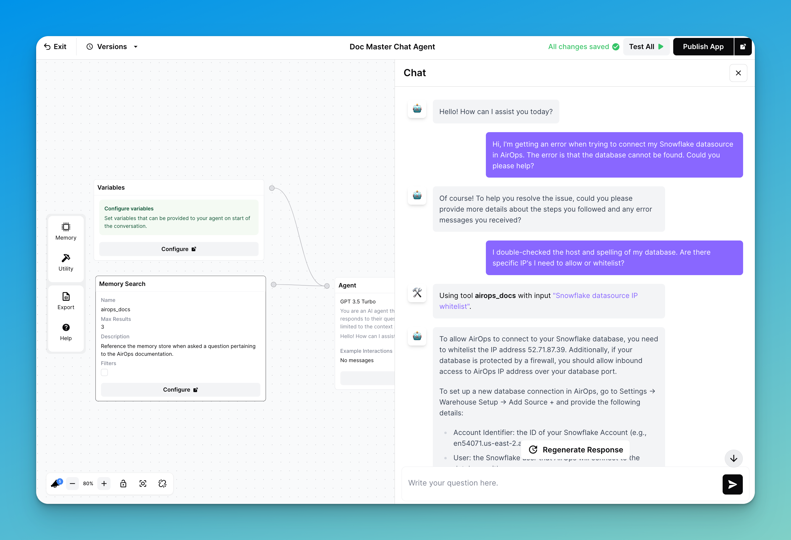 As an example, let's walk through a simple Agent we created. The Agent should help answer questions around existing documentation, and we've connected it with a Knowledge Base with AirOps docs as well as a Knowledge Base with Airtable's docs. When our Agent responds to us, it will tell us which of the two connected tools it used to generate the answer: