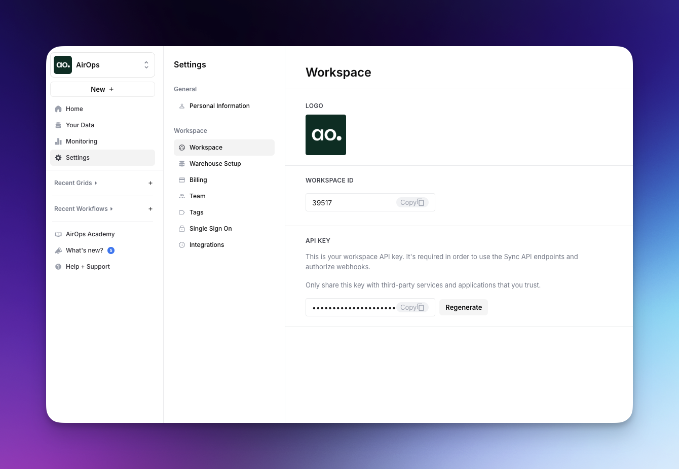 * **How do I specify which Workspace I'm using in my API calls?** -- Each Workspace has a unique ID and API Key, both available in the "Workspace" tab of the Settings page.